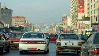 Rue Adib Ichac, reliant l'autoroute de Damas avec la Place Sassine, pratiquement la seule voie d'accès, fortement encombrée le matin. La statue de la Vierge en pleine rue exprime bien la foi affichée des chrétiens de Beyrouth.